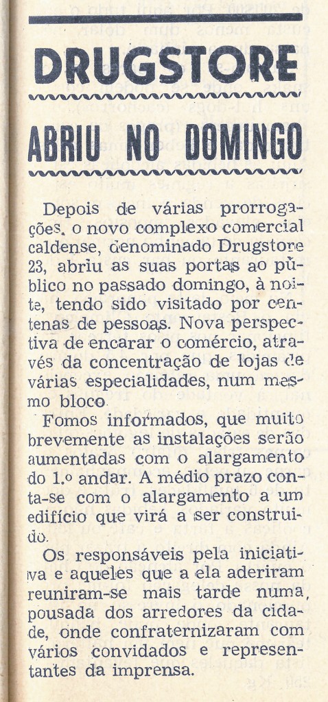 A verdade é que nas Caldas não existia nada idêntico. Refere a Gazeta das Caldas que “após várias prorrogações o novo complexo comercial caldense abriu portas no domingo à noite tendo sido visitado por centenas de pessoas”. O artigo, publicado na primeira página deste semanário, informava ainda que esta era “uma nova perspectiva de encarar o comércio, através da concentração de lojas de várias especialidades num mesmo bloco”. Mais: o Drugstore23 teria as instalções aumentadas com o previsto alargamento do 1º andar e aí chegaria às 23 lojas, tal como o nome indicava. “A médio prazo conta-se com o alargamento a um edifício que virá a ser construído”, informava o mesmo jornal.