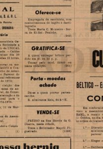 Trazemos alguns anúncios curiosos: “a Vossa hérnia deixará de vos preocupar!… Myoplastic Kleber é um método moderno incomparável. Sem mola e sem pelota, este verdadeiro músculo de socorro, reforça a parede abdominal e mantém os órgãos no seu lugar. “Como se fosse com as mãos”. Bem-estar e vigor, são obtidos com o seu uso. Podereis retomar a vossa habitual actividade. Milhares de herniados usam Myoplastic em 10 países da Europa (da Finlândia a Portugal). As aplicações são feitas pelas Agências do Institut Herniarire de Lyon (França). Podereis efectuar um ensaio, completamente gratuito em qualquer das Farmácias abaixo indicadas: CALDAS DA RAINHA – Farmácia Freitas – Dia 13 de Março (Só de tarde); ABRANTES – Farmácia Mota Ferraz Dia 14 de Março (Só de manha); TOMAR – Farmácia da Misericórdia, Rua da Infantaria 15 – Dia 14 de Março (Só de tarde). Durante o intervalo das visitas do Aplicador, as Farmácias Depositárias poderão atender todos aqueles que se lhes dirijam para adquirir cintas”.