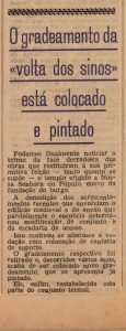 Nesta semana a Gazeta noticiava que estava finalmente colocado o gradeamento da Igreja de N. Sra. Pópulo. “Podemos finalmente noticiar o termo da fase derradeira das obras que restituíram à sua primitiva feição tanto quanto se supõe o templo erigido a Nossa Senhora do Pópulo, coevo da fundação do burgo. A demolição dos acrescentamentos recentes que envolviam o edifício medieval e do anexo que parcialmente o encobria determinou modificação de conjunto e da escadaria de acesso. Isso motivou se alterasse a vedação com colocação de cantaria de suporte. O gradeamento respectivo foi retirado e, decorridos vários anos, acaba de ser colocado novo gradeamento, que se apresenta já pintado. Eis, enfim, restabelecida parte do conjunto termal”.