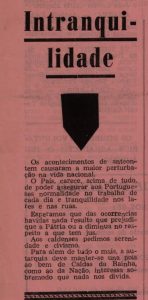 “Intranquilidade” é o título do primeiro artigo da Gazeta das Caldas que nos conta a história do 25 de abril. Com uma grande mancha negra e impresso em papel cor-de-rosa (era o que havia nesta época em que se sentia uma falta de papel gritante em todo o país), o artigo, publicado no dia 27 de abril, conta que “os acontecimentos de anteontem causaram a maior perturbação na vida nacional. O País, carece, acima de tudo, de poder assegurar aos Portugueses normalidade no trabalho de cada dia e tranquilidade nos lares e nas ruas”.