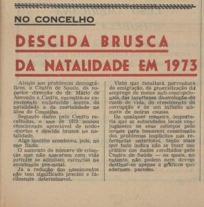 “Atento aos problemas demográficos. o Centro de Saude, da superior direcção do dr. Mário de Azevedo e Castro, encontra-se capazmente esclarecido àcerca, da natalidade e da mortalidade na área do Concelho. Segundo dados pelo Centro recolhidos, o ano de 1973 acusou crescimento apreciável de nados-mortos e descida brusca na natalidade. Algo insólito aconteceu, pois, no ano findo. O aumento do número de crianças que não nasceram com vida permite se admitam carencias na assistencia pre-natal. Já a redução dos nascimentos não tem significado preciso e fácilmente determinavel.Visto que resultará porventura da emigração, da generalização do emprego de meios anti-concepcionais, das incertezas da evolução do custo de vida, do crescimento da corrupção e de um infinito número de outras causas. De qualquer maneira, importaria que as autoridades locais conjugassem os seus esforços pelo menos para tomarem consciencia dos problemas implicitos nas referencias anteriores, tanto mais que tudo indica não se fazer uso prático dos dados recolhidos pelo Centro de Saúde os quais, no entanto, não podem nem devem destinar-se apenas a gráficos que adornam paredes”, aponta o jornal.
