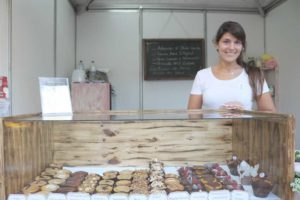 Joana Ribeiro estreou-se como expositora na Feira dos Frutos com os seus bolos “Sem Culpa”. Tratam-se de doces saudáveis, adoçados com stévia líquida e confeccionados com farinha de aveia integral, sem corantes e conservantes, chocolate negro 70% de cacau. O óleo de coco é usado apenas para derreter o chocolate, sendo que os bolos não levam qualquer adição de gordura.